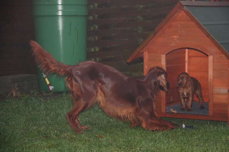 Draußen spielen im Sonnenschein., die Hundehütte kommt gut an