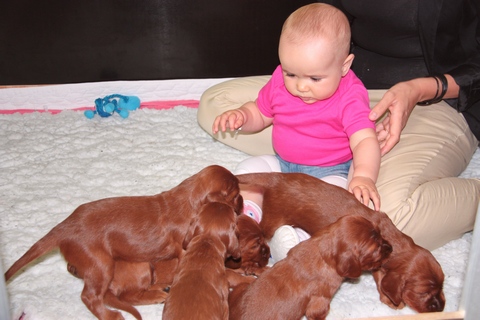 Enkelin Saphia Emeé ist heute zum ersten Mal bei den Welpen. Sie ist sehr vorsichtig und nicht weniger erstaunt, als die Welpen.