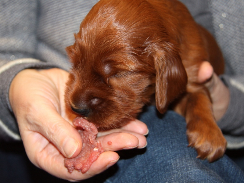 Heute kommt die nächste Überraschung, heute gibt es Tartar. Nach anfänglichem  geringen Interesse werden die Keinen plötzlich hell wach, die kleine Nase fängt an zu arbeiten und dann "stürzen" sie sich gierig auf das Fleisch. Damit werden die Schluckbewegungen angeregt, die nötig sind, um von etwas anderem zu Leben, als vom Saugen an der Mutter.