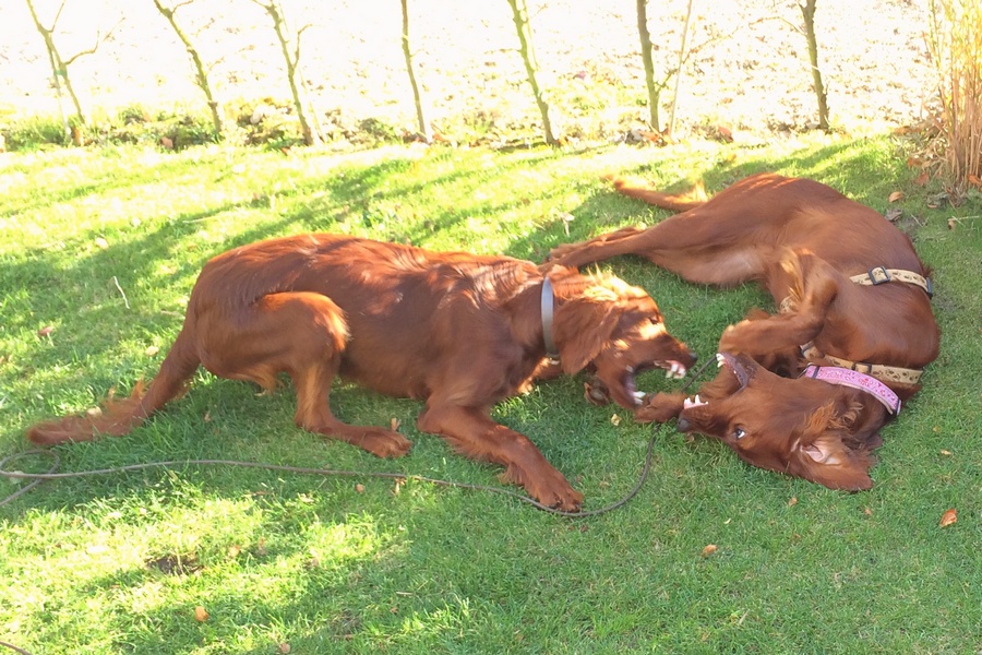 Lily (mit Geschirr) besucht Grace im Urlaub in St. Peter Ording