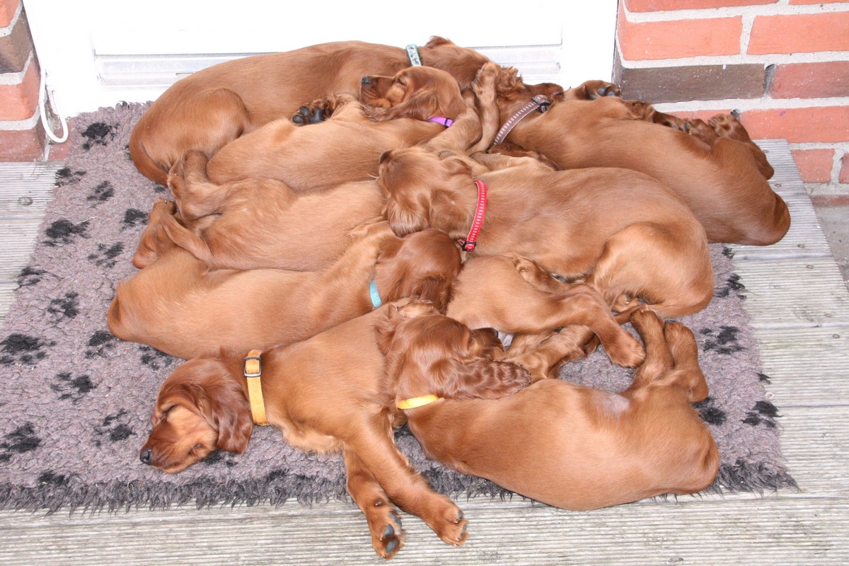 Der Umgang der Welpen untereinander wird "härter". Es wird gefaucht, geknurrt und heftig zugebissen. Es wird ausprobiert, wie weit man gehen kann. Da hört man nun öfter, wenn es weh tut.